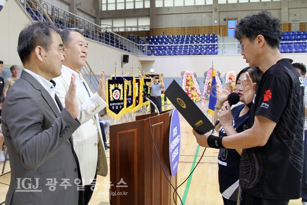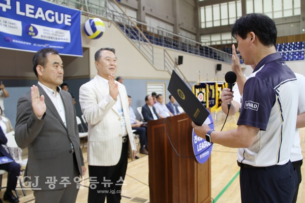 전갑수 대한장애인배구협회장(광주광역시체육회장)과 박승재 체육진흥실장은 이정중 심판대표로부터 “2025년 전국장애인배구리그전에 참가한 우리 심판일동은 경기규칙을 준수하고 공명정대하게 임할 것을 선서한다.”라는 심판선서를 받고, 공정한 경기 운영을 다짐하는 뜻깊은 순간을 함께했다.