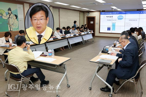 사진 설명=광산구는 13일 구청 2층 상황실에서 주민 건의 사항 처리 상황 공유회를 열고, 찾아가는 경청 구청장실, 구청장 직통 문자서비스 등 소통 창구 운영을 점검했다.