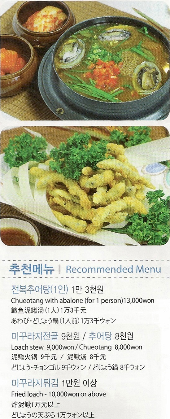 추어탕 한가지로 명가 반열에 오를 만큼 맛에 대한 자부심이 강하며, 추어탕과 미꾸라지 전골, 미꾸라지 튀김, 돌판 숙회 등에 들어가는 모든 미꾸라지를 자연산만 엄선해 사용한다. 어린이 정식(추어야채까스+튀김세트)과 전복추어탕이 별미이며, 가족 동반은 물론 귀빈 접대에도 손색이 없다.