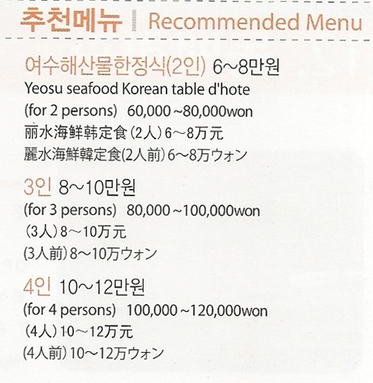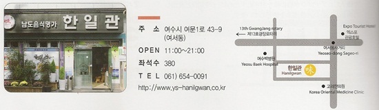 남도의 별미인 해산물 한정식 전문점으로 40여 가지에 달하는 순수 여수산 해산물을 고루 맛볼 수 있다. 3층까지 8개의 방과 연회석을 갖춰 접대나 회식자리로 부족함이 없으며, 일식과 한식을 접목시킨 네 번의 푸짐한 메인상차림에 처음 놀라고, 빼어난 맛에 한 번 놀라고, 마지막으로 저렴한 가격에 놀란다.