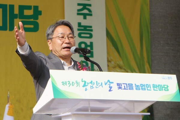 강기정 광주광역시장은 축사를 통해 “서른 번째 <농업인의 날> 축하드린다. 광주시는 전국 특·광역시 중 세 번째로 넓은 경지 면적과 두 번째로 많은 농가를 보유한 도시로, 농민공익수당을 전국 최초로 도입해 매년 8,500여 농가에 60만 원씩 지급하고 있다. 내년부터는 여성농업인 특수건강검진 지원 대상을 1,189명으로, 연령을 80세까지 확대할 예정이다.”라며 “광주시는 친환경쌀·우리밀·우리콩 산업 육성과 공익직불사업, 경영안정대책 등을 통해 농가소득 보전에 힘쓰고 있다. 기후변화와 고령화 속에서도 농업은 국민경제의 근간이다. 시는 농업이 강하고 농촌이 활기찬 광주를 만들기 위해 최선을 다하겠다”고 밝혔다.