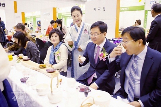 문인 광주시행정부시장, 윤장현 광주시장부인 손화정여사, 박헌규 광주시생명농업과장은 ‘제9회 광주국제차(茶)문화전시회’에서 다도를 체험하며 "차 한잔의 여유로 몸과 마음의 휴식을 얻고, 삶의 새로운 에너지를 체움 받으시길 바란다"고 말했다.