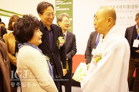문인 광주시행정부시장, 김영선 전남도행정부시장, 신환섭 김대중컨벤션센터 사장, 이용부 보성군수, 윤장현 광주시장부인 손화정여사, 여연스님은 ‘제9회 광주국제차(茶)문화전시회’개막식에 참석해 축하를 전했다.