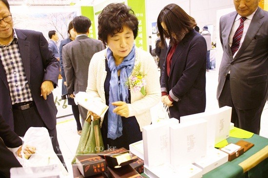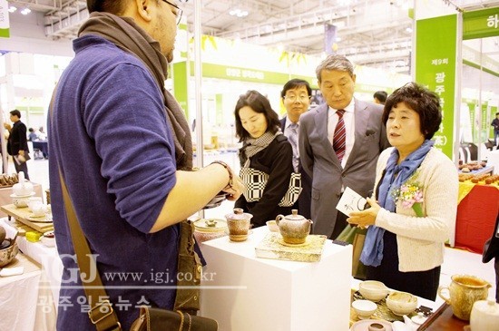 윤장현 광주시장부인 손화정여사는 ‘제9회 광주국제차(茶)문화전시회’에 참여한 다기업체를 방문해 다양한 상품들을 살펴본후 직접 구매를 하며 격려를 전했다.