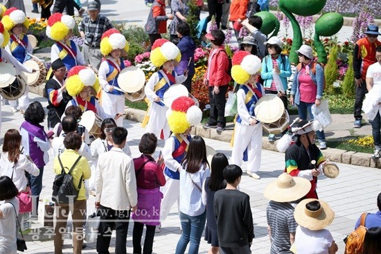 2016 고양국제꽃박람회에선 네 차례 펼쳐지는 거리퍼레이드는 이번 꽃박람회 인기 프로그램으로 군악대, 캐릭터, 풍물예술단 등이 참여하는 퍼레이드 행렬이 이어진다. 사진은 꽃박람회 거리 퍼레이드에 참여해 신명나는 공연을 펼치는 풍물예술단의 모습. 다음 퍼레이드는 오는 8일과 14일 2차례 더 진행될 예정.