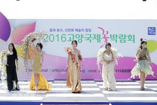 어린이날인 5일 고양시 호수공원은 2016 고양국제꽃박람회를 찾은 시민들로 북적이는 가운데 국제교류무대에서 바디 플라워 쇼가 개최돼 관람객들의 관심을 모았다. 꽃박람회에서만 볼 수 있는 ‘바디 플라워 쇼’는 꽃으로 장식한 옷을 입고하는 진행되는 패션쇼. 사진은 꽃으로 장식된 아름다운 옷을 입고 바디 플라워 쇼를 선보이고 있는 모델들의 모습.