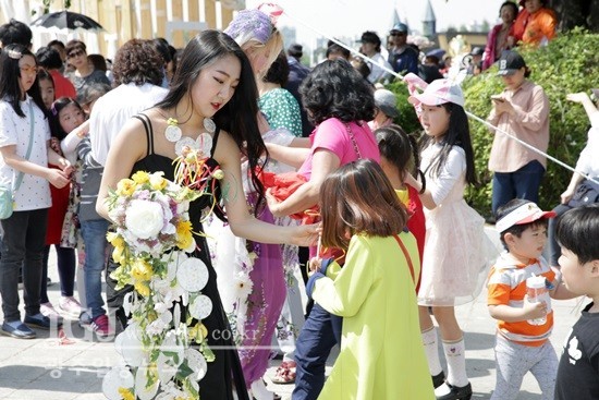 5일 어린이날을 맞아 많은 시민들이 2016 고양국제꽃박람회를 찾은 가운데 꽃박람회에서만 볼 수 있는 바디 플라워 쇼가 관람객들의 호응 속에 펼쳐졌다. 바디 플라워 쇼가 끝난 후 멋진 패션쇼를 선보인 모델들이 어린이날을 맞아 꽃박람회를 찾은 아이들에게 사탕 선물을 나눠 주고 있다.