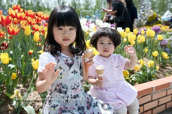 2016 고양국제꽃박람회가 열리고 있는 고양시 호수공원이 5일 어린이날을 기념해 꽃박람회를 찾은 가족들로 북적인다. 사진은 튤립이 가득 피어있는 튤립정원에 앉아 즐거운 하루를 보내고 있는 두 자매의 모습. 5일부터 8일까지 나흘간의 황금연휴 동안 2016 고양국제꽃박람회에서는 온 가족이 함께 즐길 수 있는 풍성한 이벤트가 펼쳐진다.