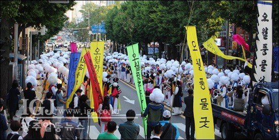 정의당 노회찬 대표와 윤소하. 이정미 등 당선자들이 역시 행진을 하고 있다.