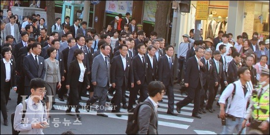 그 뒤에는 안철수 대표와 박지원 원내대표 등 국민의 당 당선자가, 또 바로 뒤에는 우상호 원내대표와 송영길,표창원, 기동민 등 더불어민주당 당선자들이, 더 뒤에는 정의당 노회찬 대표와 이정미, 윤소하 당선자 등이 함께 했다.
