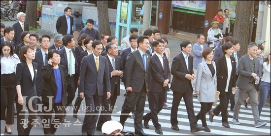 안철수 대표와 박지원 원대대표 등 국민의당 당선자들이 금남로를 행진하고 있다.