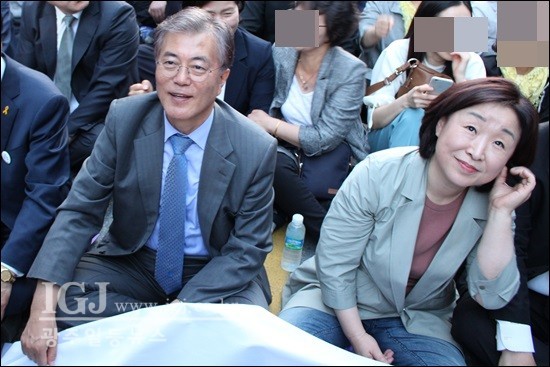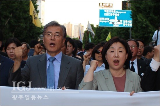 더민주 문재인 전 대표와 심상정 정의당 대표가 '임을 위한 행진곡'을 제창하고 있다.