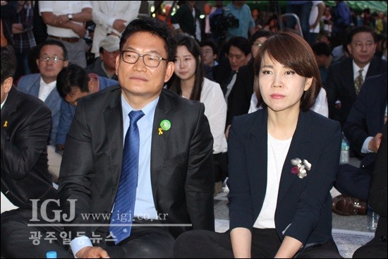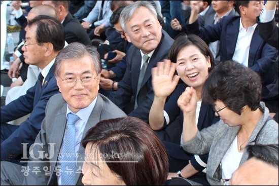 더불어민주당 문재인 전 대표와 함께 있던 양향자 광주서구갑 출마자가 손을 들어 인사를 하고 있다.