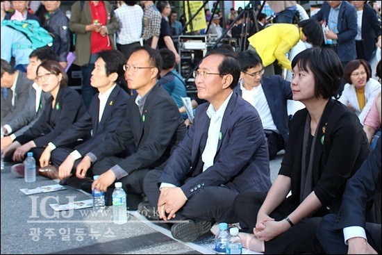 윤장현 광주광역시장, 장휘국 광주광역시 교육감, 조희연 서울특별시 교육감, 더불어민주당 문재인 전 대표, 정의당 심상정 대표 등이 '임을 위한 행진곡' 제창을 촉구하는 펼침막과 함께 '임을 위한 행진곡'을 제창하고 있다.