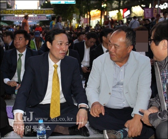기동민 당선자와 유동수 당선자가 전야제 중간에 얘기를 나누고 있다.