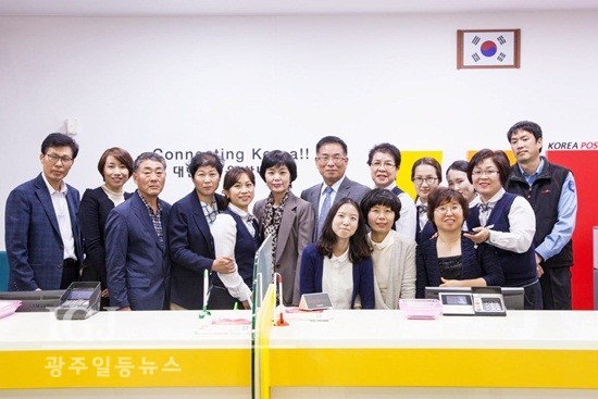 박순혜 지부장이 전 진도우체국 정영섭 전 진도우체국장, 송정아. 박종윤, 노현애, 박현엽. 정태일. 박미자, 김송화, 조수연, 김명희, 박상근,, 최은주, 문희정, 주순덕 등 전 영업과직원들과 함께 기념촬영.