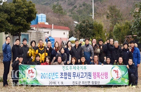 박순혜 지부장은 2016.1.9. 진도우체국지부 전 조합원이 모인가운데 「2016년도 조합원 무사고기원 행복산행」을 마치고, 함께 기념촬영.