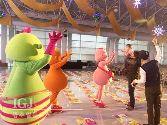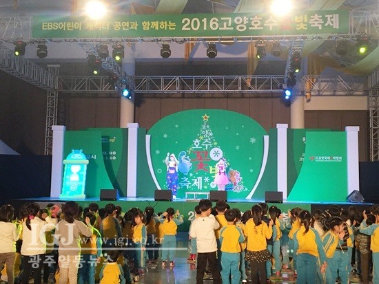 오는 1월 8일까지 고양시 호수공원에서 개최되는 ‘고양호수꽃빛축제’에서는 어린이들에게 인기만점인 ‘방귀대장 뿡뿡이’와 ‘EBS 딩동댕 유치원 뚜앙’ 등 어린이 캐릭터 공연으로 동심을 사로잡고 있다. 사진은 축제를 찾은 어린이들이 공연 속 율동을 따라하며 즐거운 시간을 보내고 있는 모습. ‘2016고양호수꽃빛축제’의 주간 어린이 공연 관람시간은 11시에서 17시까지며 입장료는 어린이 8천원, 중학생이상은 6천원이다.