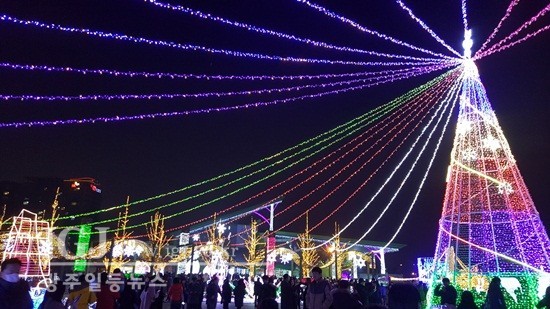 고양시 호수공원의 40m 황금빛 터널을 통해 ‘고양호수꽃빛축제’에 들어오면 빛으로 옷을 갈아입은 나무들 사이로 알록달록 대형트리 조형물이 연말연시 분위기를 고조시키고 있다.